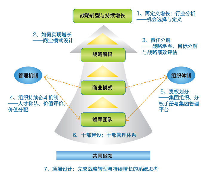 增长是一切经营管理的原点,环境与行业分析选择、界定增长点,商业模式是实现增长的系统策略,以战略地图为核心的战略解码是战略目标的层层分解,组织与机制是激发团队实现战略目标的责权利机制,共同纲领是团队实现公司持续成功的经营管理的系统原则,是团队建设的核心工具。增长、商业模式、目标分解、组织、机制与共同纲领形成企业围绕增长或战略转型的系统解决方案。