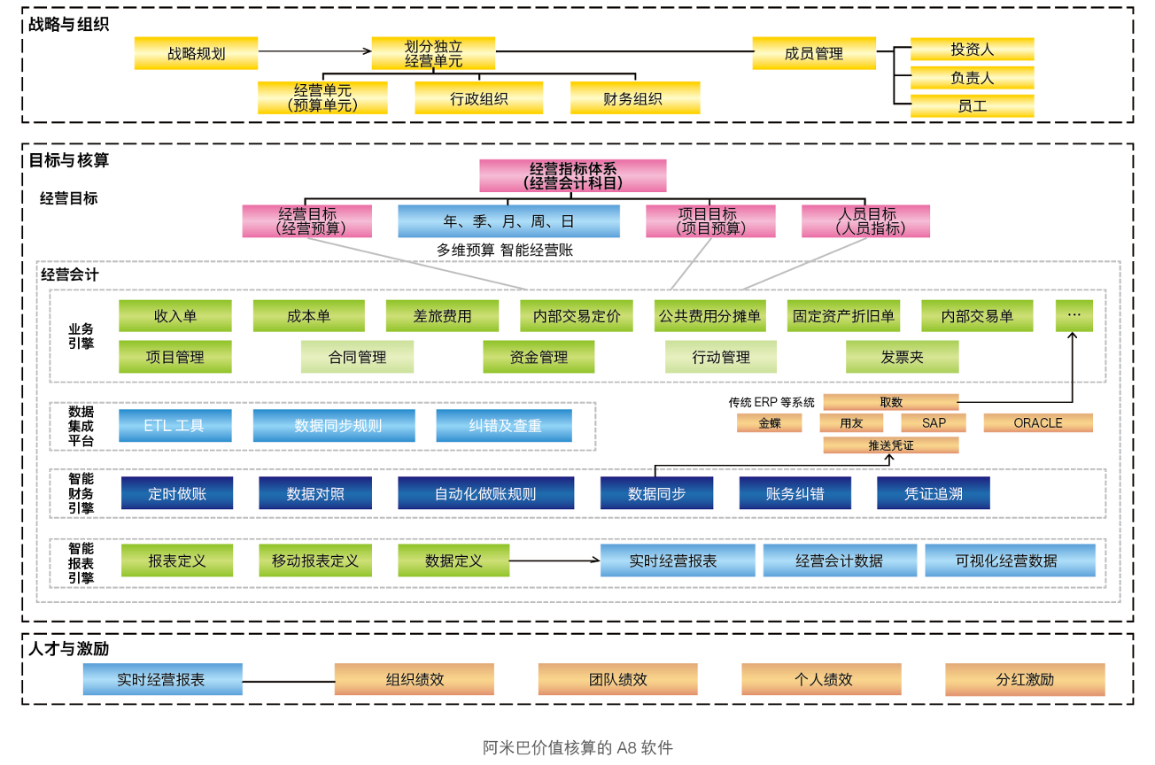 (1)顶层设计——平台赋能。OB欧宝体育搭建“后台+中台+前端+生态”的平台赋能型自主经营体,拉通组织内部流程,架构组织外部生态,赋能自主经营体。 (2)数字经营—— IT软件。为提高数据核算效率和反馈速度,OB欧宝体育自主开发A8阿米巴价值核算软件,通过会计核算软件获取收入、费用等科目数据,以“智能财务”为核心,系统自动生成经营会计报表,独立呈现经营数据,为阿米巴数字化经营奠定基础,帮助企业实现真正“经营数字化”。