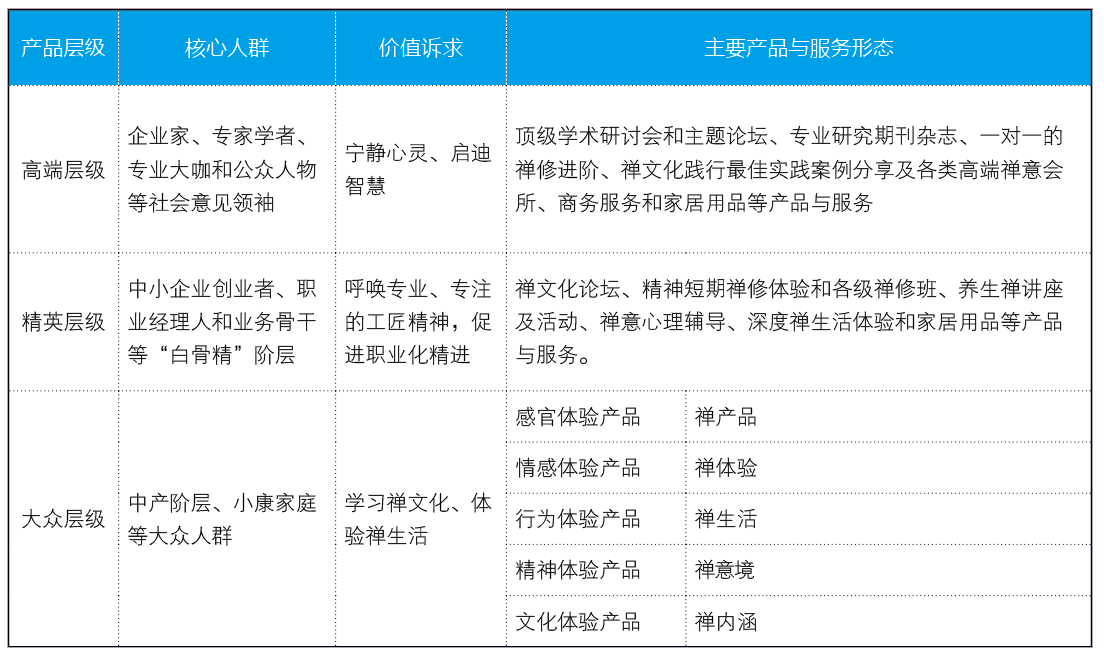 作为可以面向市场、可以营销的产品,禅必须找到目标客户群的刚需和痛点,针对性地进行产品的内涵和外延的策划与设计。在现实的市场中,禅文化产品有三类客户群:高端的各界领袖与名流、中端的白领职业经理人和中产及小康的大众群体,要分层分类地定义产品核心价值,设计产品形式及组合。