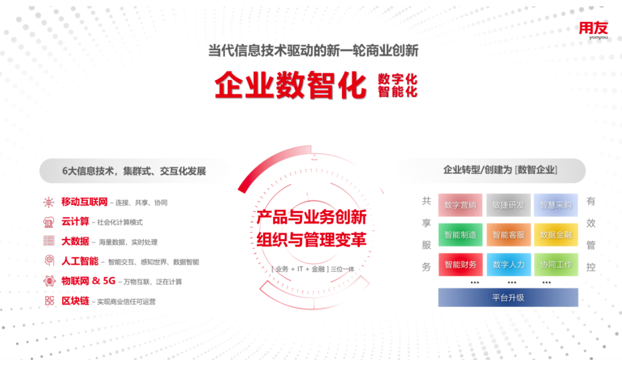 最后一点,技术在平台。数智化涉及到技术那么多,而且这些技术还在快速变化,每个企业不可能都具备这样的能力,即便今天具备了,不代表明天还具备。这一点大家不要担心,跟大家用手机一样,手机的技术极其复杂,但是我们使用是很简单的,因为技术都在技术平台,包括用友这样的厂商。我们在平台里面已经把这些技术给提供了,技术都在平台里面,大家应用就可以了。
