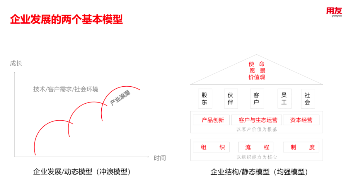 下面这两个模型,是我自己十几年前整理的企业发展的框架模型:一个叫企业发展模型或动态模型,是放在时间轴的角度来看企业的发展,动态地去看;第二个模型是结构性模型,是一个静态模型,把一个企业组织剖开,看它里面到底是什么样的要素和结构。
