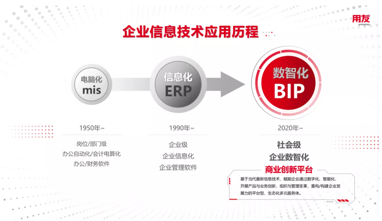 今天已经进入第三个阶段,就是刚才讲到的数智化阶段,上一代是一个系统,这一代光是系统解决不了今天企业的要求,它应该是一个平台,我们叫做商业创新平(BIP)。