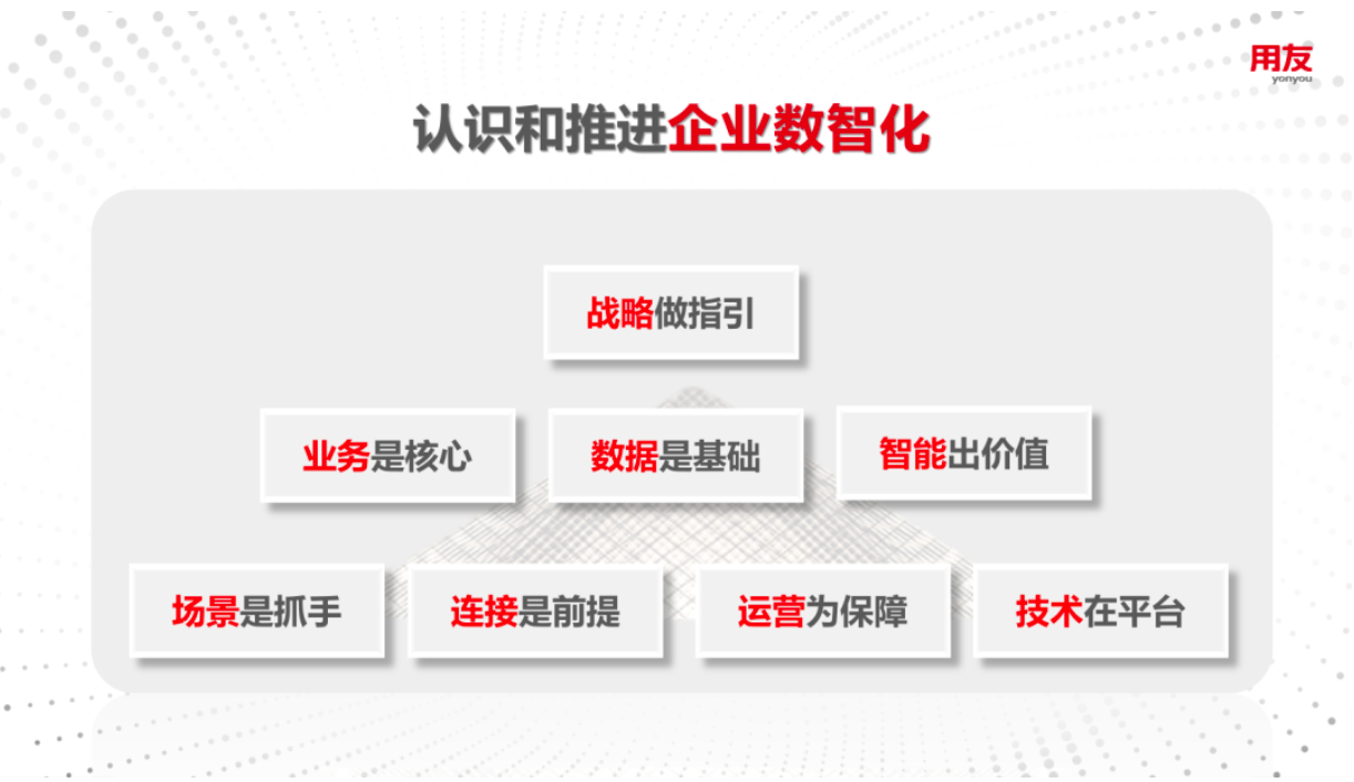 从服务企业数智化的实践来看,我们觉得有这么几个方面可以作为企业推进数智化的一个参考。
