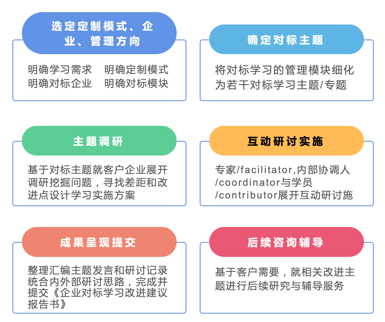 基于我们长期积累的研究基础,我们将为企业提供定制化的“学习-改进辅导服务解决方案”。基于企业实际需求,我们将以多样化的模块组合方式为企业定制标杆管理学习改进方案。