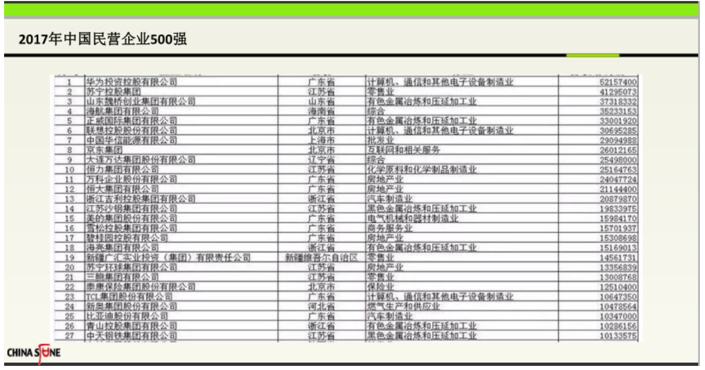 2017年达到千亿级的中国民营企业,只有27家。千亿级企业,基本都处在电子、汽车、燃气、房地产、零售、家电、计算机、保险等行业,离终端消费者、客户近的行业的容易产生大企业;离终端远的,比如化工、有色金属等行业的民营企业很难做到千亿级企业。关键在于处于什么样的行业。