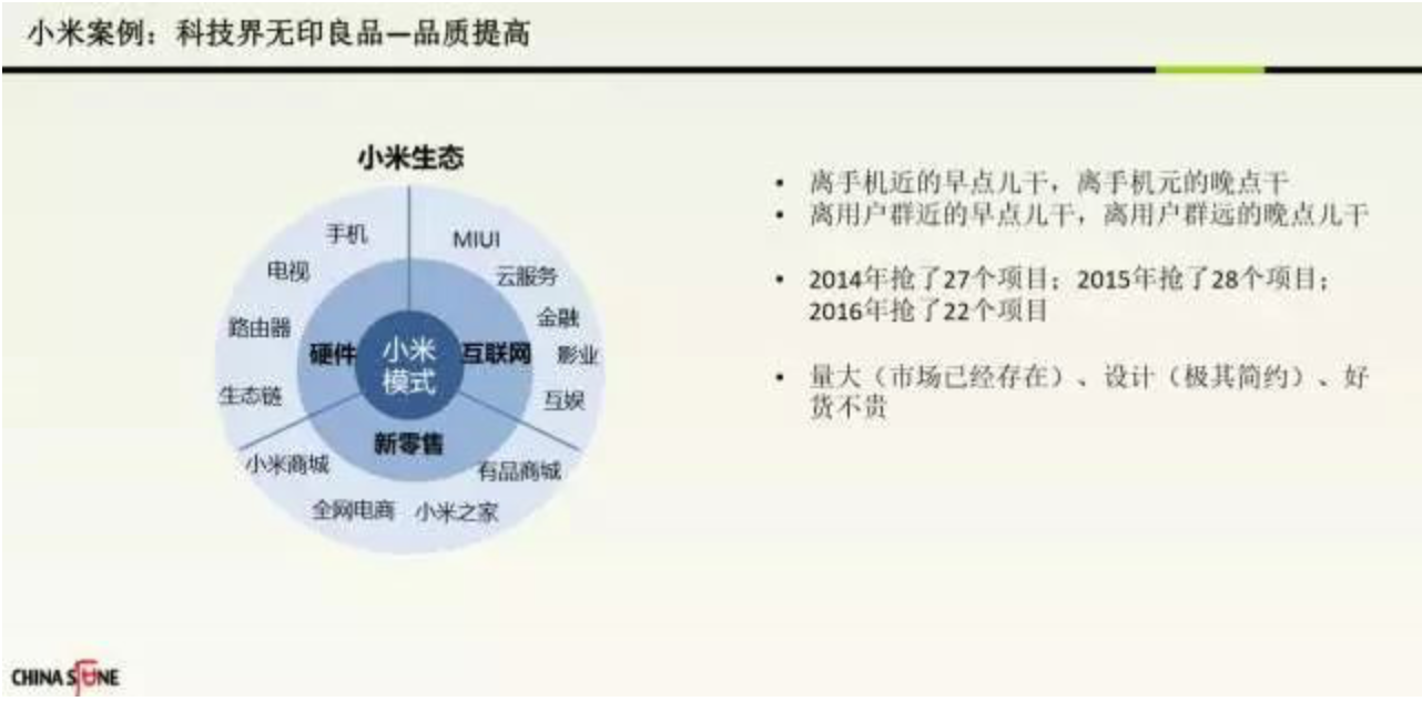 小米要做科技界的无印良品,主张“离手机近的早点儿干,离手机远的晚点干;离用户群近的早点儿干,离用户群远的晚点儿干”,也就是离消费者越近,越能产生大机会。所以小米在2014年抢了27个项目,2015年抢了28个,2016年抢了22个,在存量市场上靠设计,靠有竞争力的成本来抢占市场。但由于小米的模式一定是建立在产能过剩的基础上,制造商分到的利润就很薄弱,所以小米的模式也有局限性。