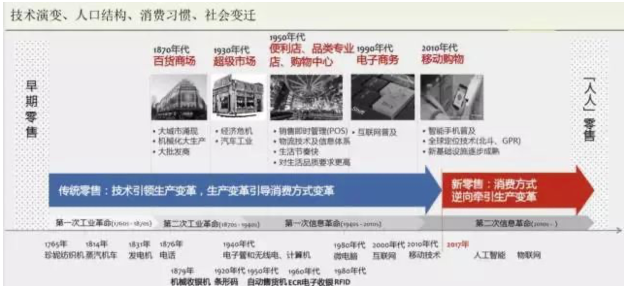 其次,关于消费习惯、社会变迁,1870年代是百货时代,大城市涌现,人口消费比较集中,有百货公司、机械化大生产、大批发商。到了1930年代,汽车业比较发达,有了超级市场。到了50年代,由于销售即时管理,包括物流技术、信息技术的提升,和人们生活节奏加快,对生活品质要求提高,便利店、品类专卖店、购物中心就建立起来了。到了90年代,根据技术和人口消费习惯变化,进入电子商务和移动购物时代。这时候整个零售的危机来源,是新增客户不再进店了,传统零售面临危机,新零售应运而生。