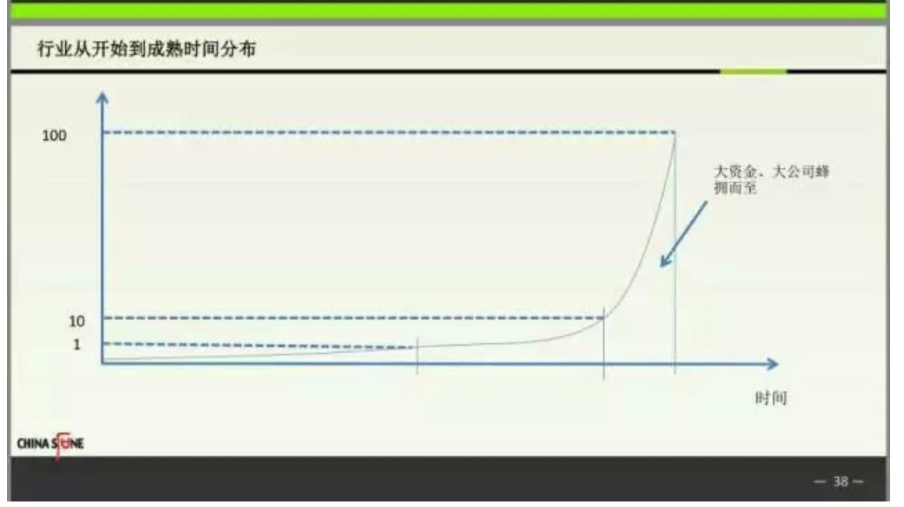 行业从开始到成熟的时间分布,从零到一的时候很缓慢;从一到十的时候,高端产品已经出来了;从十到一百的时候,大资金大公司蜂拥而上,形成指数级的增长。任何一个产业从开始到成熟,都会经过缓慢发展到加速发展,再到最后市场起色的过程。