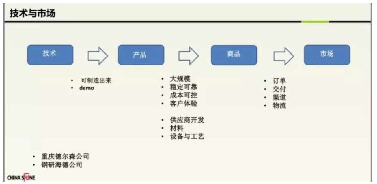 技术到产品、到商品、到市场,大概投资比例,技术是1、产品是10、商品是100。光有技术不行,要有产品,要制造出来。由产品再到商品,必须大规模稳定,成本可控,生产出来,还包括客户体验、供应商、开发、材料、设备与工艺;市场这边还有订单、交付、渠道、物流。设备和工艺往往是商品的核心竞争力。