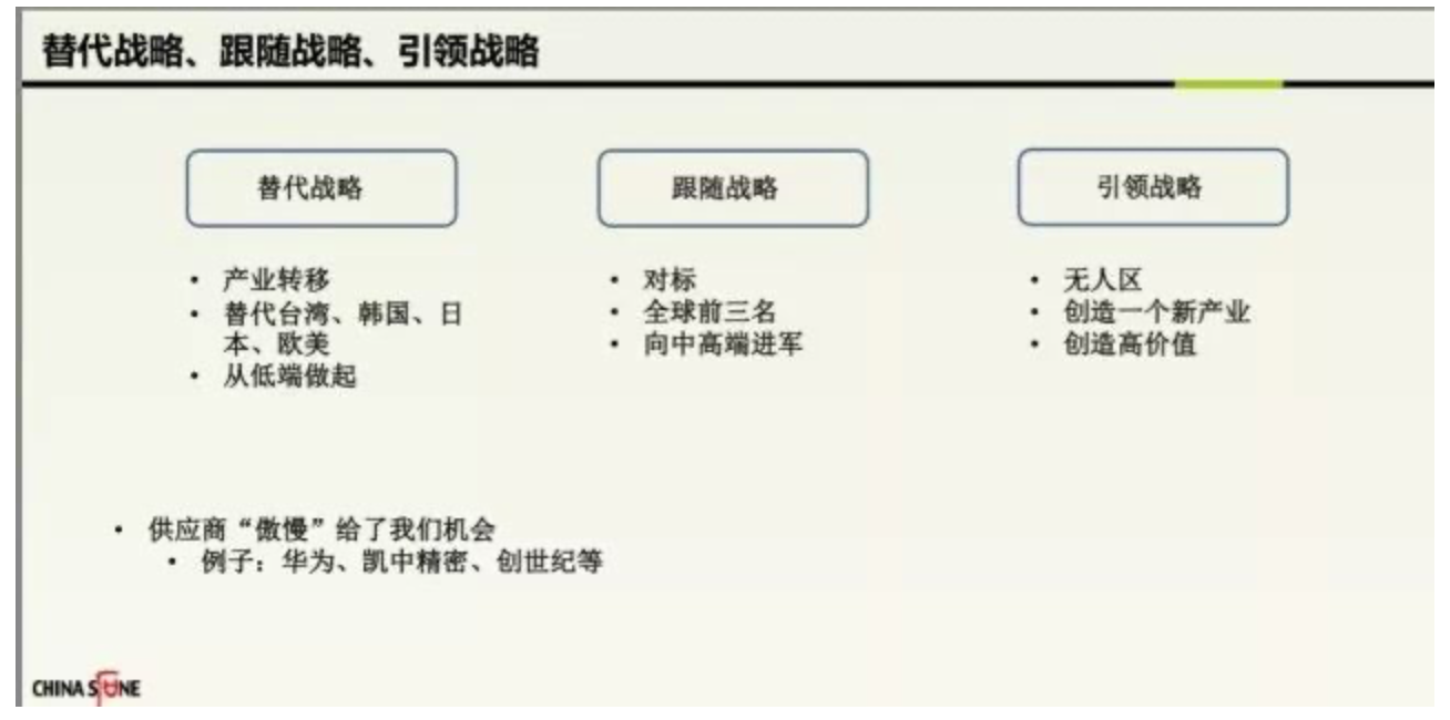 战略层面,一般大企业增长都会经历三个过程:替代、跟随、引领。中国大多数产业就是从替代战略中起来的。接着是跟随战略,就是对标,向中高端进军。最后能够进行引领。中国只要政府给机会,企业就能起来。当市场已经存在,就从下面向上攻击。日本、韩国供应商的傲慢给了我们机会。