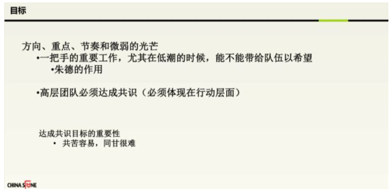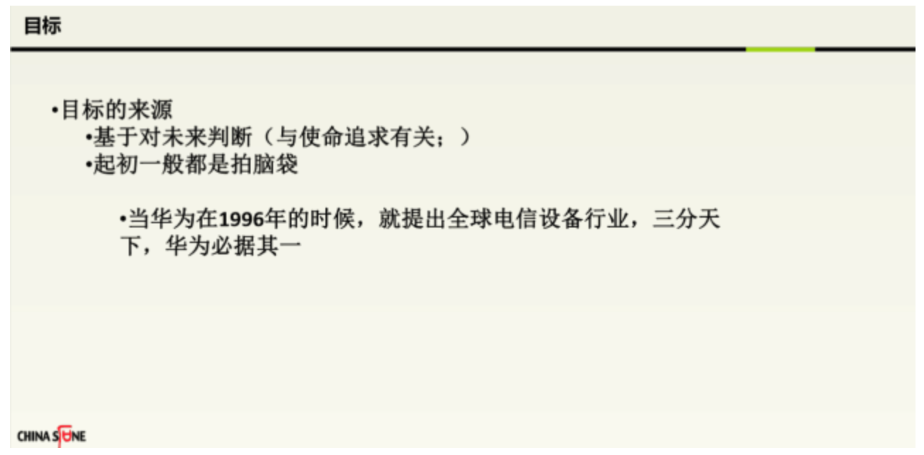 一个组织必定会有其目标,目标是基于对未来的判断。起初一般都是拍脑袋,像华为1996年的时候就提出全球电信设备行业,必居其一。组织有了目标之后,就会有一种精神力量,整个公司可以凝聚共识。例如谷歌的食堂文化。