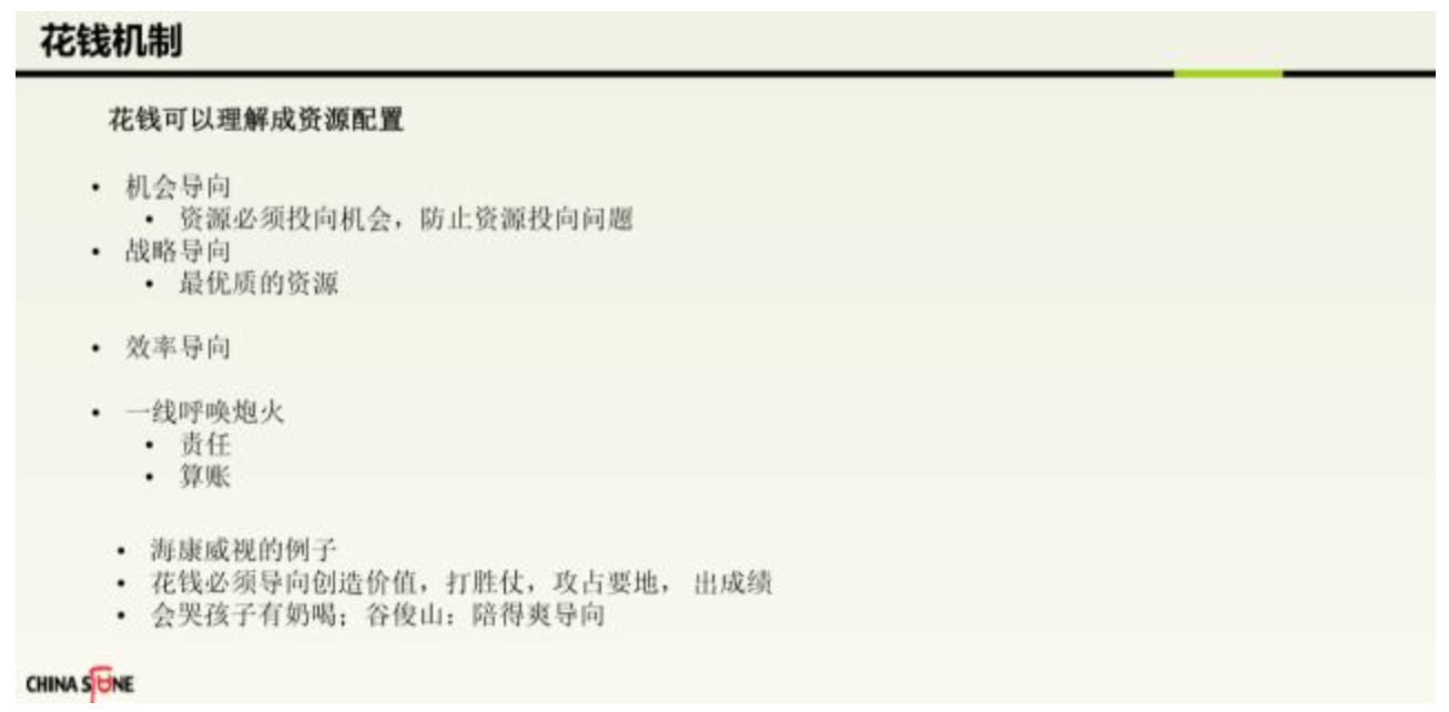 花钱可以理解成资源配置,资源必须投向机会,要用最优质的资源留住机会,防止将资源投向问题,要有效率导向的眼光。花钱必须导向创造价值,打胜仗,出成绩。