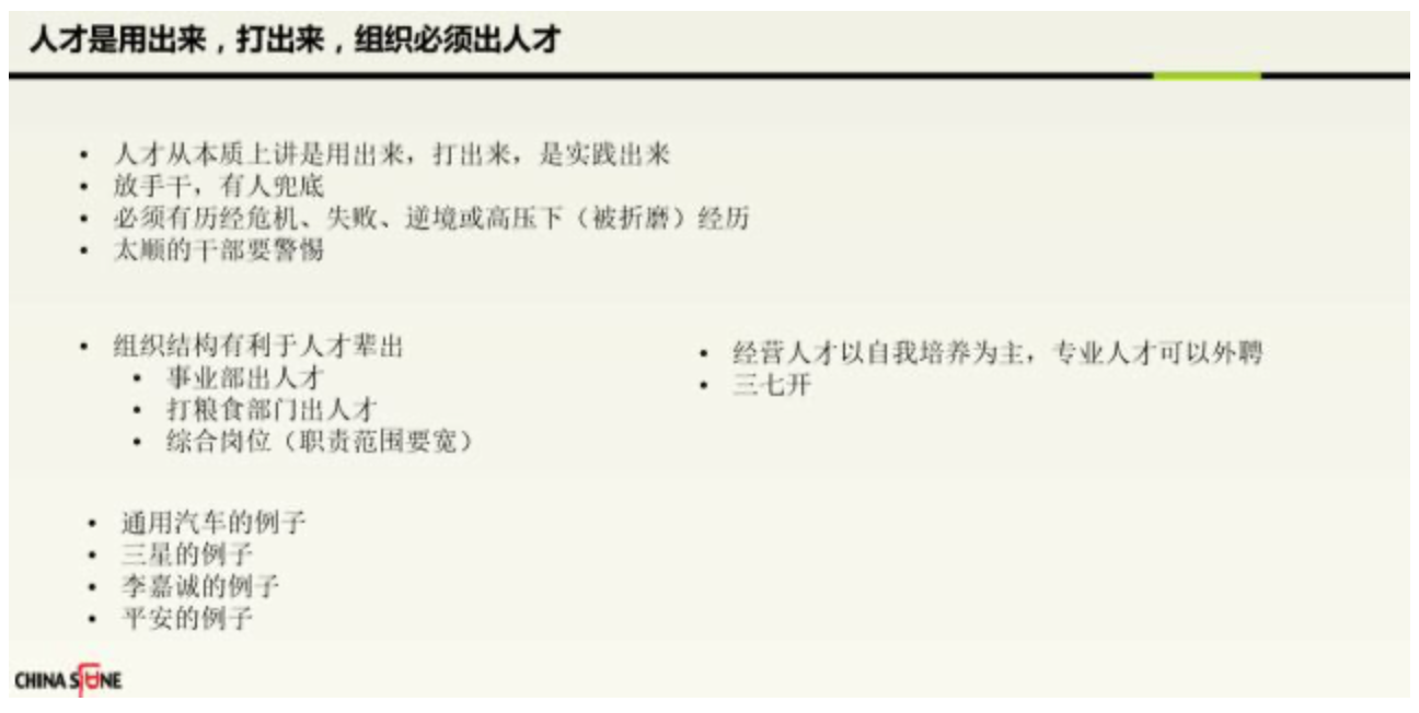人才本质上是用出来的、打出来的,要有放手干的魄力,必须有历经危机、失败、逆境或高压的经历。组织结构要有利于出人才,经营人才要以自我培养为主,专业人才可以外聘。