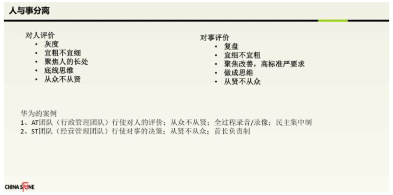 人才管理的关键在于机制,机制是什么?简练总结,就是凭什么获取报酬、凭什么分配资源。华为人才管理做得好的地方就是,“升官”与“发财”分离(升官可以理解为晋升、中长期利益;发财以短期利益为主,达标就拿钱),考核与评价分离(对基层员工以考核为主;对于中高层,要以价值观来评价),人与事分离(对于人与事的评价,有两套体系)。