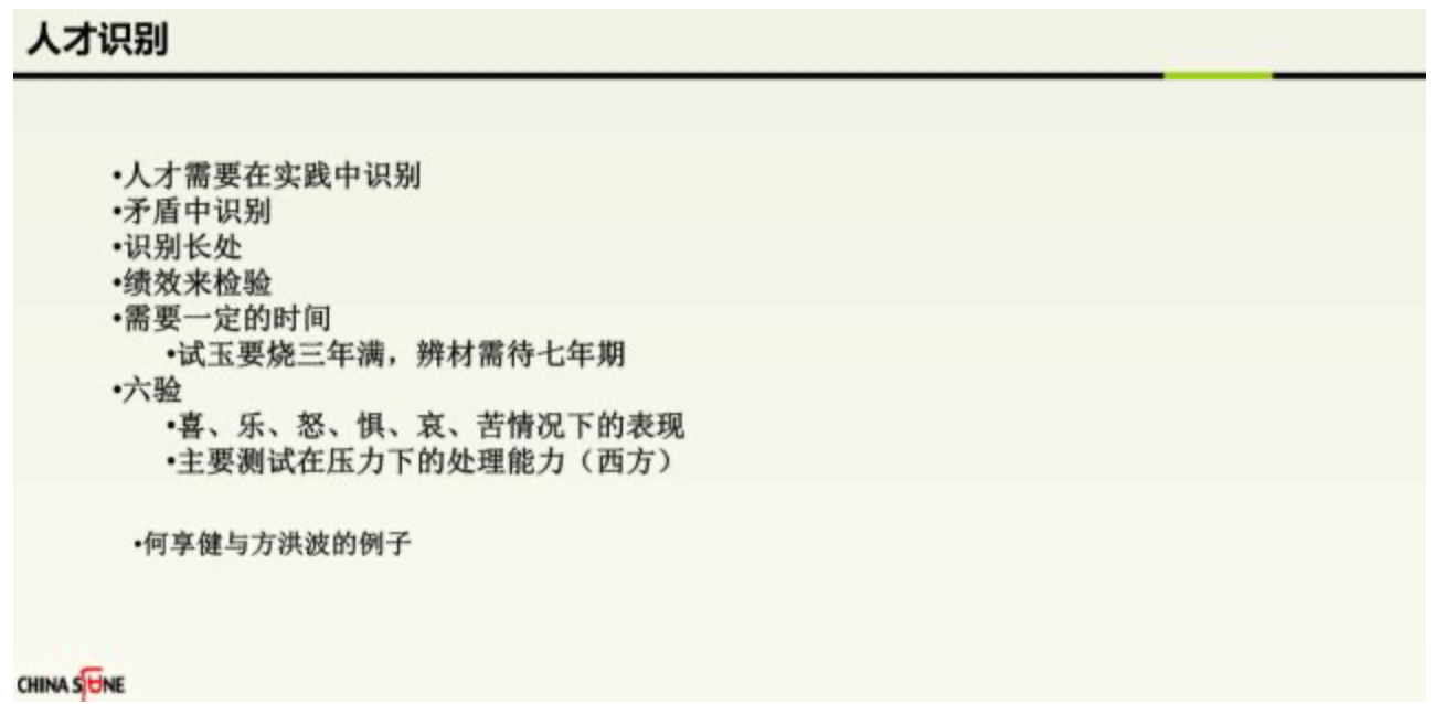 要学会识别人才,人才需要在长期的工作中发现,需要一定的时间,通过考察绩效来检验。试玉要烧三年满,辨材须待七年期。要观察在压力下的表现,这也是西方通常使用的测试。人才的衡量标准是企业驱动人才的重要工具,一般有任职资格、素质模型、薪酬标准、评价标准,等等。