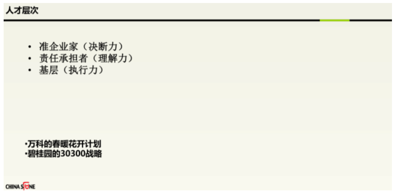 人才的分层,实际上就是怎样做大。中国的企业人才主要以自我培养为主,因为中国人力资源的职业经理人市场不发达。万科的“春暖花开”,一期招十二个人,全球招募六十个人。这六十人,类似于“小王石”,要承担将万科带领到万亿的责任,所以万科在全球找准企业家。碧桂园的“30300”战略,主要都是在寻找人才。有了一流人才,不增长都难。