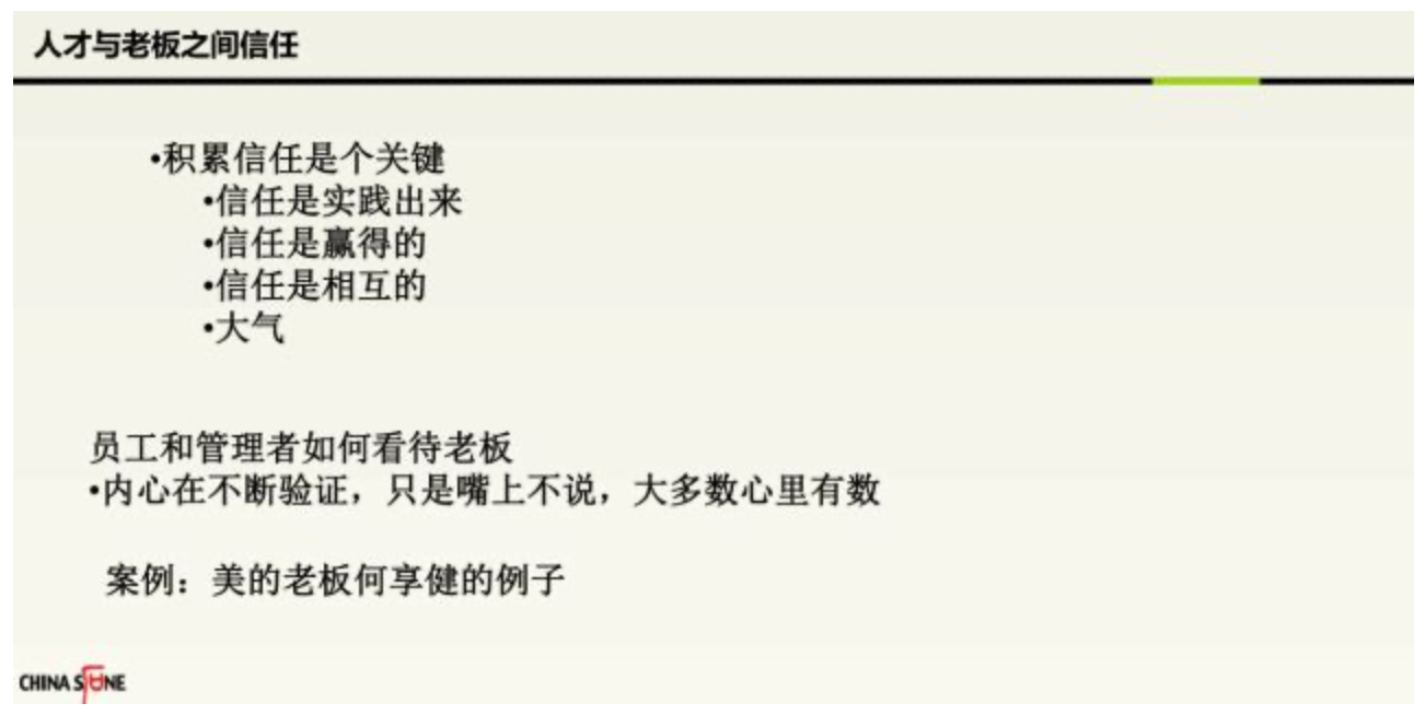 人才与老板之间要互相信任,员工和管理者如何看待老板,是通过不断的实践,在内心加以验证,从而得到的结果。美的老板何享健做的就很好,对员工很大气,与员工形成了互相信任的关系。