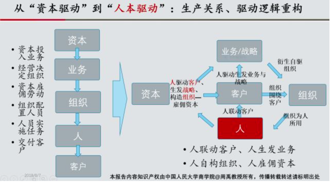 西方教科书上写就的基本组织和管理逻辑,应该被打破了。过去两百年来西方的管理学基本走的是投入-产出、控制论、结构化这样的一条逻辑,告诉我们的企业经营发生逻辑是:“资本投资业务—为业务制定战略--战略决定组织--组织雇佣人员—人员完成工作—交付客户”;但是,人本经济新的生产关系应该把驱动要素转变过来了,就是我说的,让那些能创新、敢创新、愿担当的人来驱动(海尔把他们叫创客),让这些人直接与客户发生连接(海尔把这个关系叫做人单合一),让人直接与客户发生连接从而去生发业务,人—(直接联结)客户——生发业务、生成战略(是在与客户的联接中去生发创新战略、而不是仅仅在既定的某种战略计划中被动执行)——给这些人以权力去自主构建组织(自组织),组织不再是人的前置设定、人也不再是被装载到某种界定组织结构中的被动要素,而是让这些人自主构建组织,让人不再是组织附庸、而让组织成为人自主创新的工具——进而,这些能够连接客户、生发业务、构造自组织的人,拿着客户、业务、组织去雇佣资本、为我所用、创造增值。
