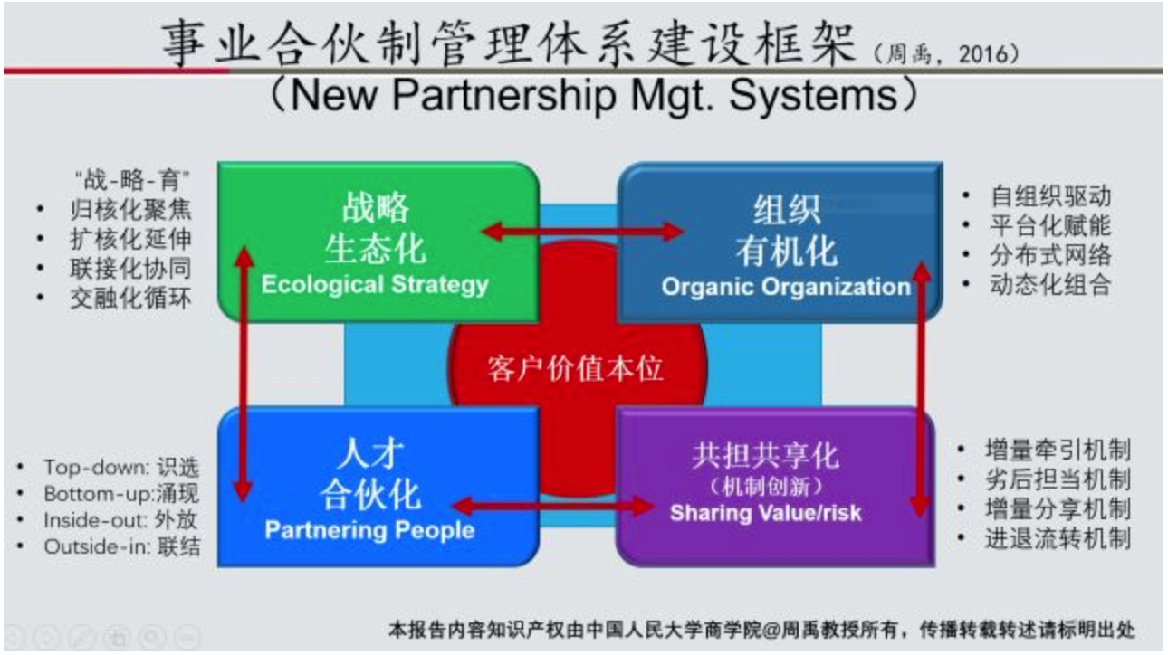 最后再强调一下,我们的事业合伙制,绝不是狭隘的搞股权、跟投等机制,而是对整个企业制度做改造,在治理逻辑上回归客户价值,和内外所有利益相关方,平行共生,按照优先劣后级去分享,去承担风险,进而分享剩余。通过价值创造、增量创造劣后担当,实现共享共赢。我建构了一套可系统设计、实施的“五位一体”的管理框架。