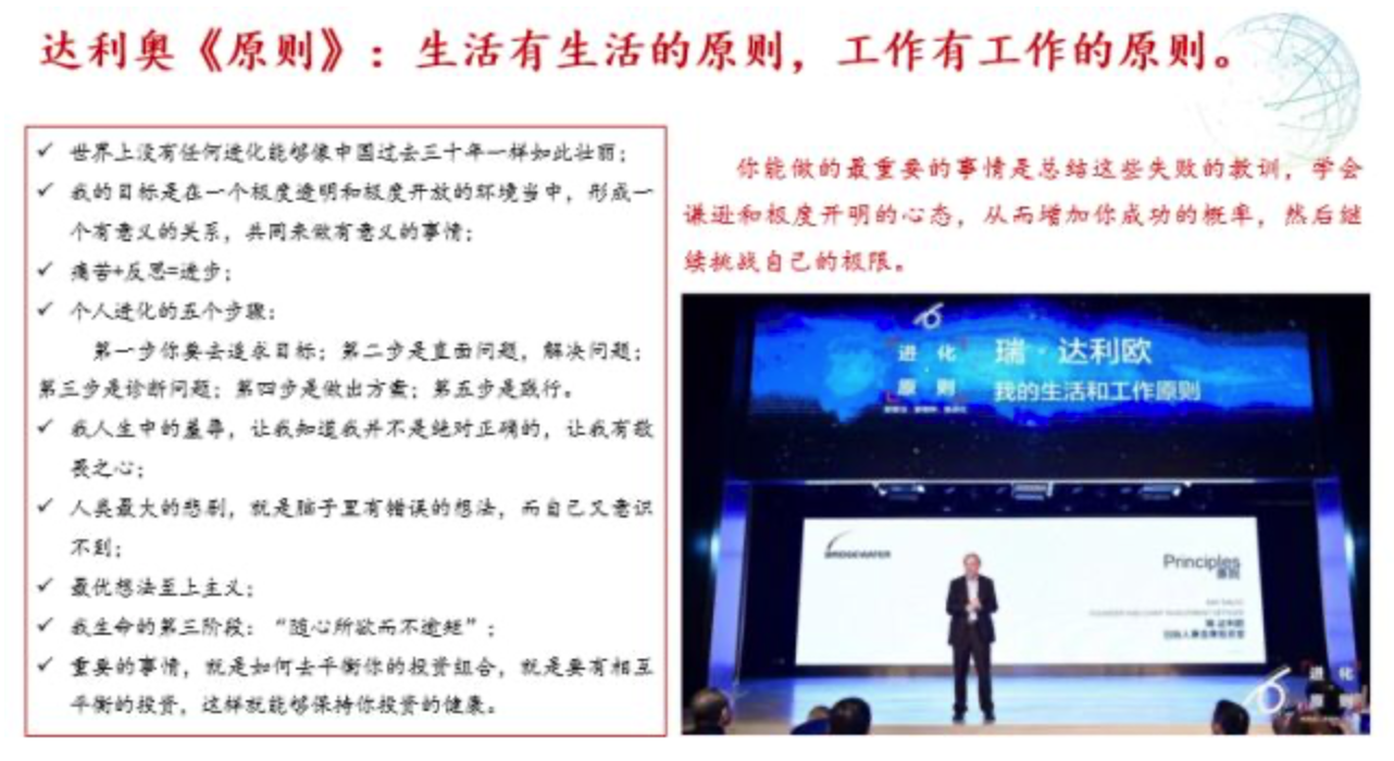 上图是我阅读达利奥《原则》的收获,其中值得一提的有两点:第一,痛苦+反思=进步;第二,达利奥并没有简单地在民主决策制和个人专制中二选一,而是选择了一种更有意义的做法,用一个高度开放的体系鼓励大家发言。绝对的一人一票不见得科学,一个人说了算更不科学,达利奥走出一条中间道路,鼓励大家发表自己的看法,提出自己的专业见解,并没有简单用一人一票制来决策。