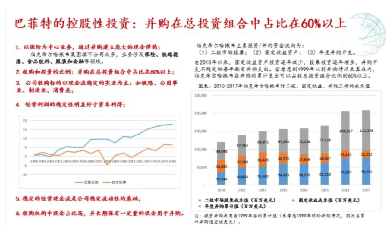 巴菲特控股的公司有80家,远远超乎想象。近几年发生了一些变化,包括他认为在二级市场上不容易以低估值买得股票,所以增大并购,这也是巴菲特的一个重要思维。巴菲特的确是长袖善舞,做出这种动作非常难,因为企业其实是不容易控股的。美国跟中国有一个最大的分别,在中国控制这么多企业很容易分崩离析。国外早就形成了成熟的职业经理人文化,股权本身是高度分散的,这些比较成熟的职业操守文化和法律,给他们提供了重要的支持,所以他可以做这种80家控股型的投资。关于控股他还有他的一些秘诀。