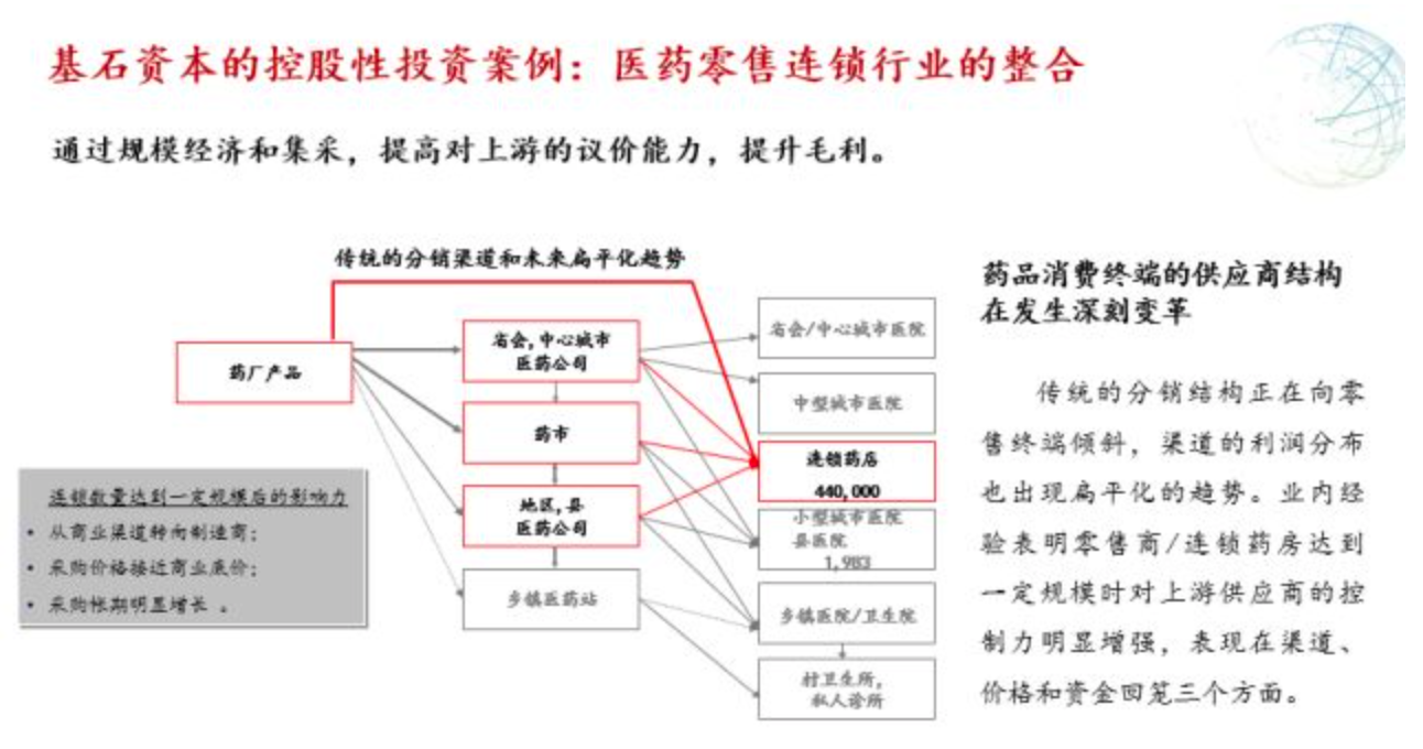 并购成功的要素,包括产业理解和产业资源,一些正确的并购策略,以及对管理层道德风险的控制。控股性投资并没有标准型的答案,是随机应变的。真正一些好的动作、好的标的也是这样。策略并无标准步骤和答案,需要创造性。这两天会议大家可以看到我们在医药连锁上收购的逻辑和思维,在药房已经完成的投资量大概有50亿,在2018年能够达到55亿,很快可以构建成一个国内比较前列的药房连锁企业。