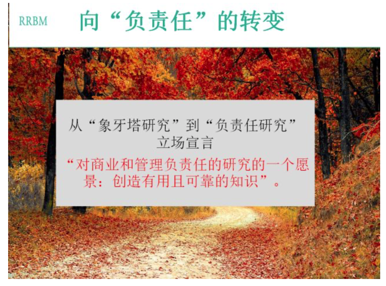 我们提倡一个转变——从象牙塔研究转变到负责任的研究,我们写了一个立场宣言,题目就是我们对商业和管理负责任的研究的一个愿景:创造有用且可靠的知识,这是宣言文章的标题。什么叫负责任的研究呢?就是指我们的研究工作应该是生产可信且可靠知识的科学工作,这些知识能直接或间接用于解决商业组织和社会中的重要问题。负责任研究的宗旨是生产能帮助我们的学生、商业或组织可以应对21世纪重大挑战的知识。