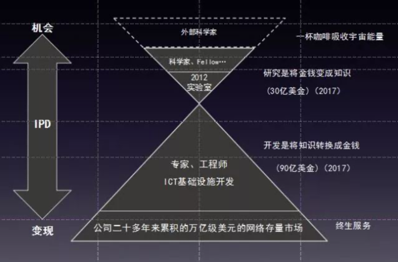 这个图代表着华为今天和未来的研发结构,上面的小三角,是将金钱变为知识的过程,虚线部分主要是跟全球大学、研究机构同方向的外部科学家进行合作。