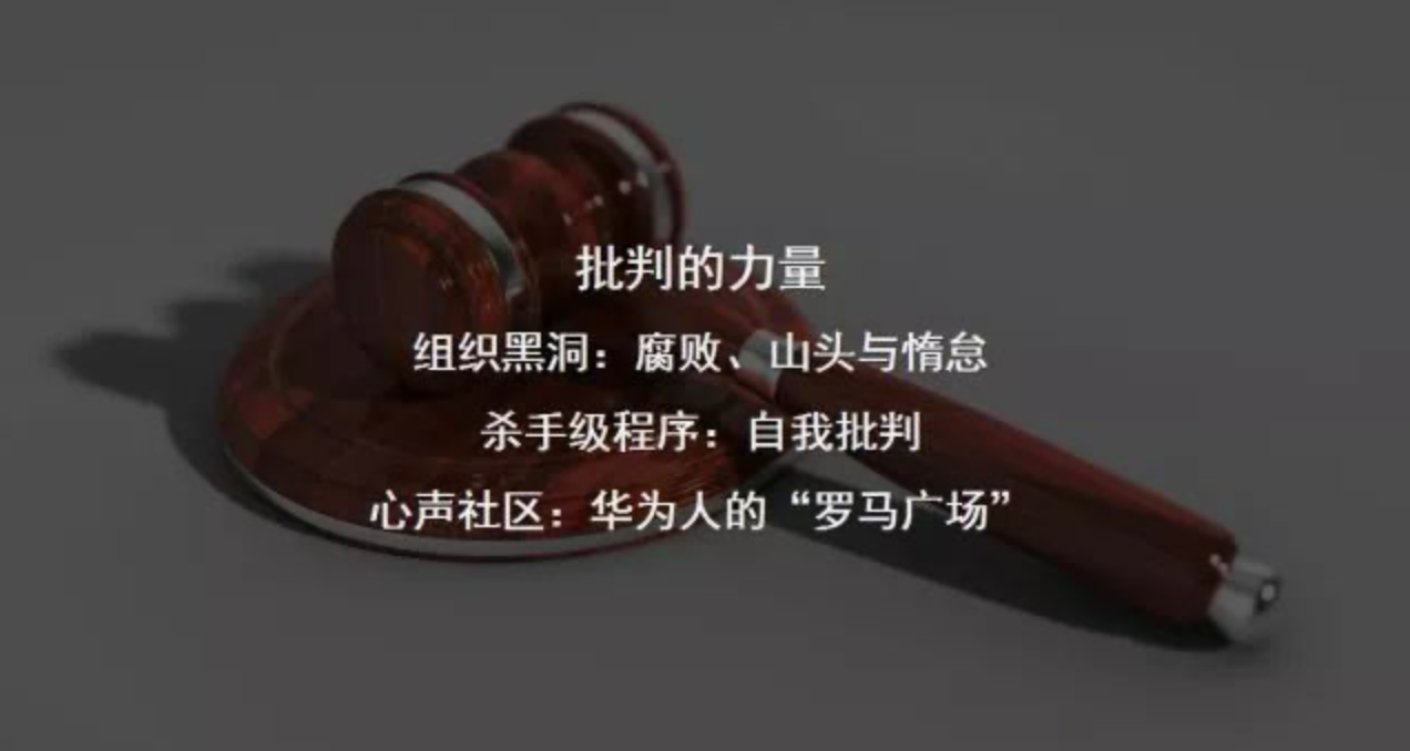 华为在自我批判方面,有很多传统做法,也有创新,比如华为内部网站心声社区,我认为它是企业民主治理很重要的创新试验。公司绝大多数重大和非重大的政策、决定,包括任老板的讲话,各级高管的讲话都会第一时间发表在内部网站上,让18万员工评头论足,而且发帖者可以实名,也可以穿马甲,谁都不允许追查发帖者……