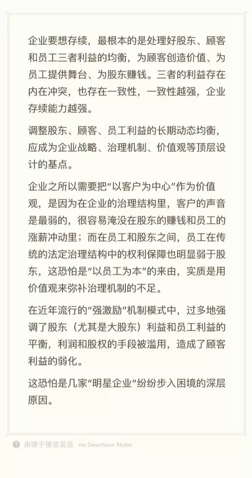唤起员工对管理事务的参与感,本就是“管理”自带的责任,管理必须平衡好企业各方主体(股东、员工、顾客、社会等)的利益,企业才能持久。德鲁克曾经批评工会,认为工会人为制造了对立,不利于企业问题的解决。把企业交给企业家,不是企业家有多高尚,而是利益决定这个群体最有动力,也最有可能平衡好企业各方主体的利益。