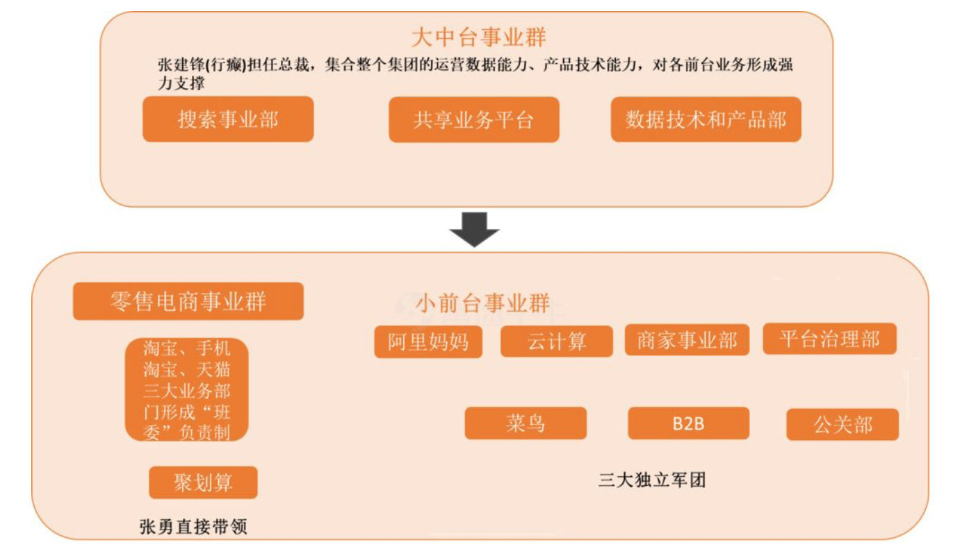 2015年12月,阿里再次架构调整,推出“大中台、小前台”战略,新设中台事业群。