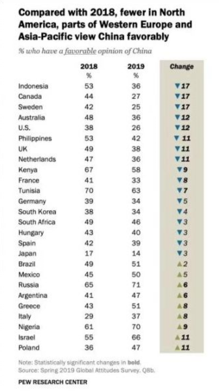 上图是美国PEW研究中心的一个调查报告,研究其他国家的人对中国持有好感的比例。2018年日本喜欢中国的只有17%,而2019年甚至下降到了14%。其中的原因很复杂,大家可以自行分析。
