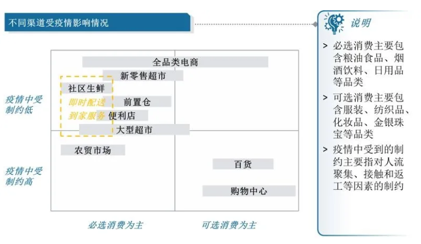 线下的必选品类零售商如大型超市、超市、社区生鲜和便利店在此次疫情中起到了保障供应、平抑物价和稳定恐慌情绪的重大作用。