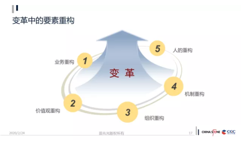 企业的变革是一个艰难的事,需要改变的东西涉及组织上下、业务内外方方面面,业务要重构,价值观要重构,组织和机制要重构,最关键的是人也要重构。