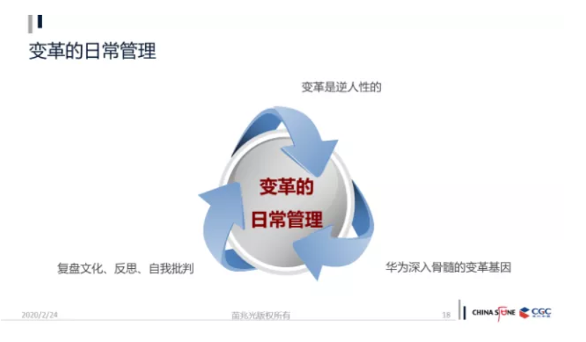 这种种做法,都是在增强企业日常变革的意识和能力,在点点滴滴中培养、强化一种变革精神、变革意志。