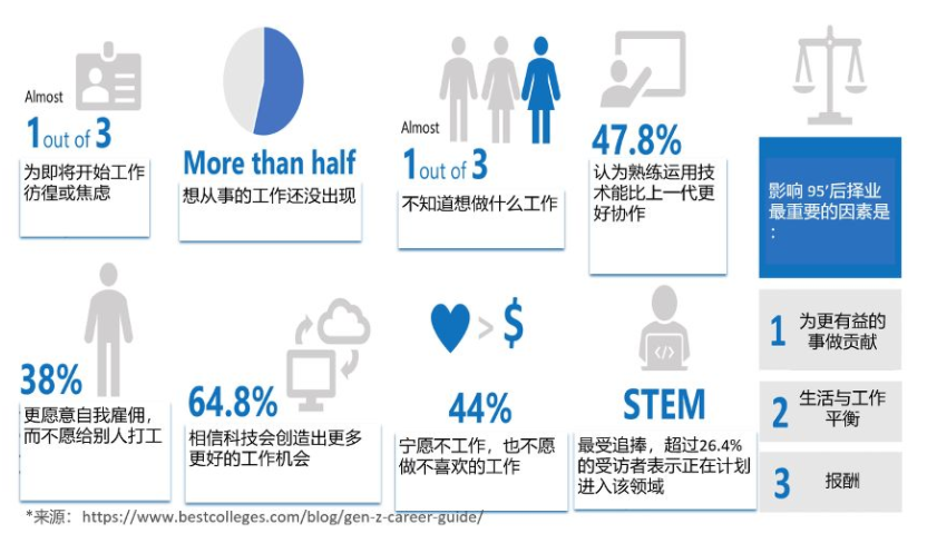 这个时代,年轻人已经不愿意加班做无意义的工作,他们需要使命感、人生意义。根据统计数据显示,影响95后择业的前三大因素中,薪酬位于最后。前两位分别是“为更有意义的事做贡献”和“生活与工作平衡”。