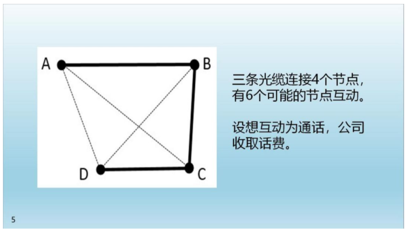 网络的收入增加得快,怎么个快法?假如这是一个电话网络,4个客户可以带来6次通话(A-B、B-C、C-D、A-D、A-C、B-D),每次通话收1块钱,那就有6块钱。