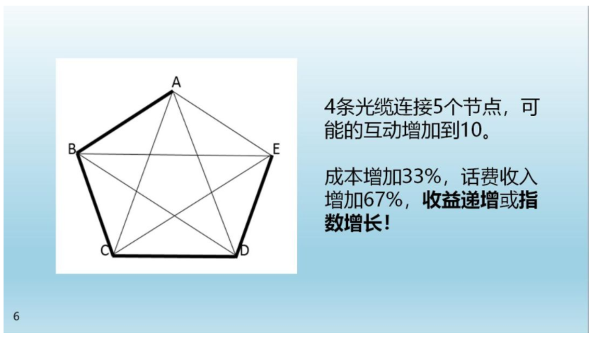 网络有一个很特殊的性质,就是网络的建设成本的增加,比它服务客户的增加要慢,但是,收入增加比客户数量增加得快。