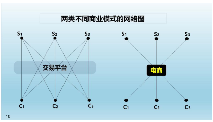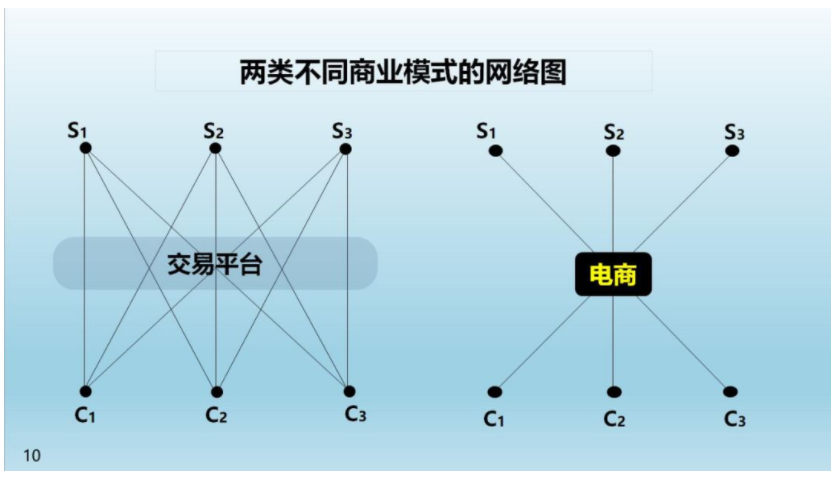 再看右边那张图,我们发现它的网络比左边更稀疏。因为在自营模式下,供应商不和消费者直接打交道,只和电商打交道,比如和亚马逊打交道。