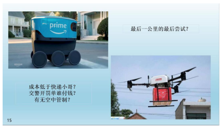 京东为了解决最后一公里,开发了无人机。但这是解决方案吗?各位能想象小区上无人机飞来飞去吗?城市的空中交通怎么办呢?最关键的是,无人驾驶小车和无人机真的就比快递小哥的成本低吗?这是自营电商必须回答的问题。