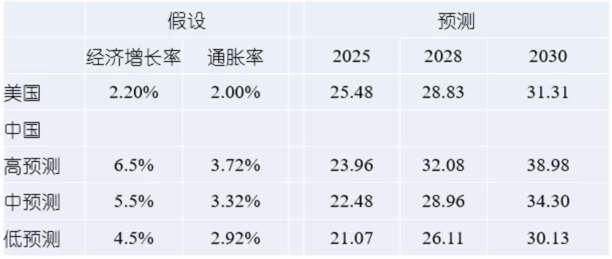 我做了一个预测,美国在未来一段时间的平均增速是2.2%,通胀率是2%,对中国有高、中、低三种预测。这个预测中,中国的通货膨胀率以美元计价,所以有人民币兑美元升值的因素。如果中国的增速能按照高预测达到6.5%,中国将到2028年远超美国;按照中预测5.5%的增速,2028年也将超越美国;如果按低预测4.5%的增速,到2030年也能超过美国。换言之,如果中国的增长能够比美国快3.3个百分点,未来十年内就可以超越美国成为世界第一大经济体。这是按汇率计算的,如果是按购买力平价计算,中国早已经超过美国,成为世界第一大经济体。