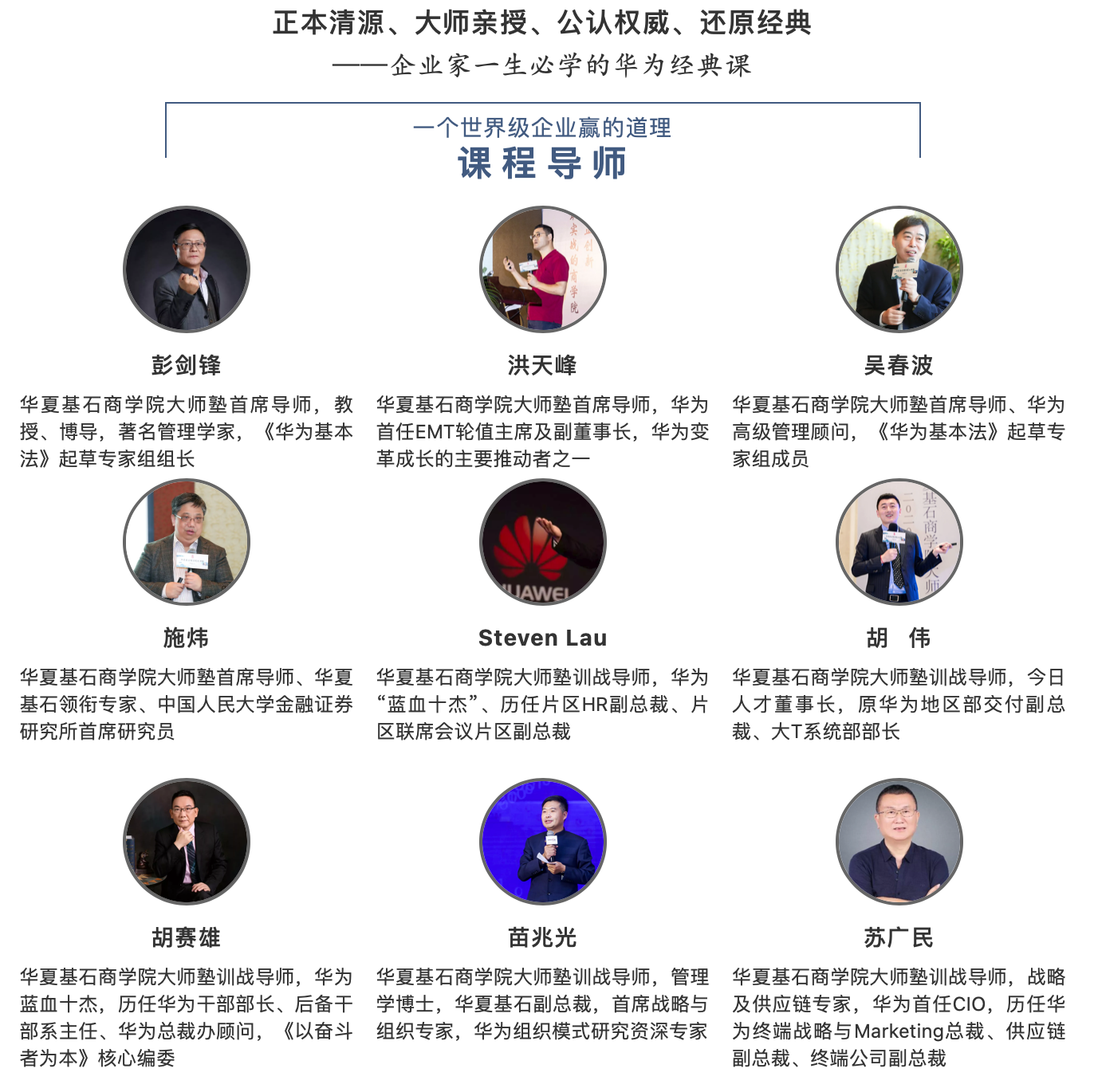 胡赛雄老师,是华为公司蓝血十杰,历任华为干部部长、后备干部系主任、华为总裁办顾问,《以奋斗者为本》核心编委,出版有研究华为重要著作《华为增长法》。