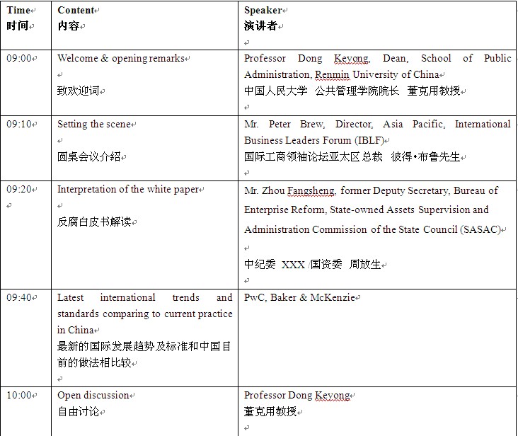 诚邀您参加2011年4月8日在中国人民大学举行的中国工商领袖论坛第十七次圆桌会议---首部中国反腐白皮书《中国的反腐败和廉政建设》, 它的发布将对商业产生什么样的影响?企业应当如何支持政府推动廉洁和透明?