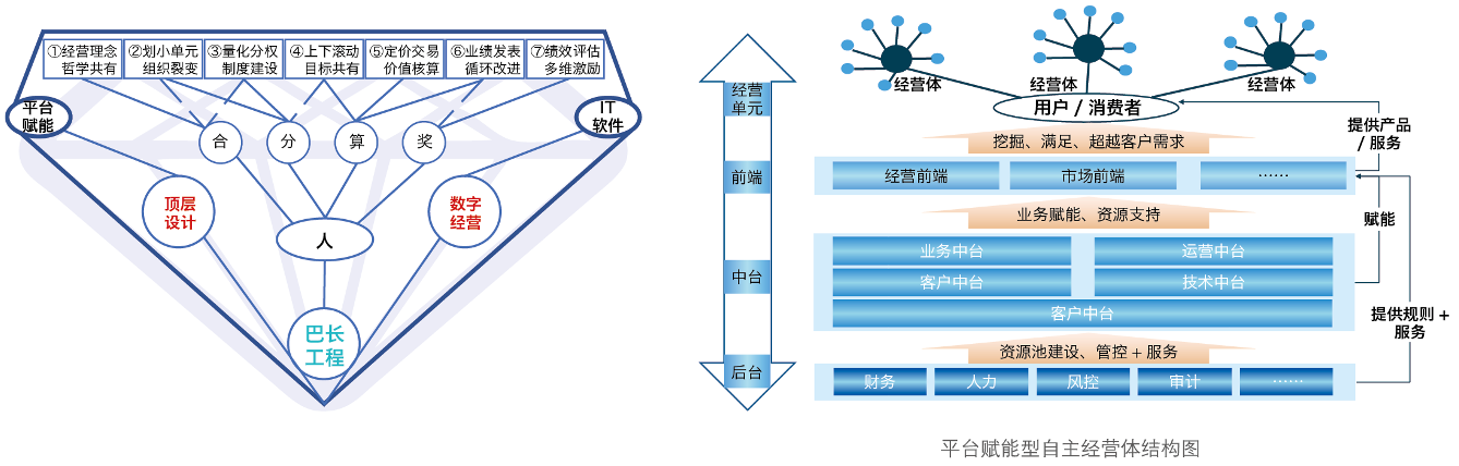 本模型强调以人出发,即以人为起点和终点,以顶层设计与数字经营为两翼,形成独特的“合、分、算、奖”体系,实现价值创造、价值评估、价值分配的统一。其中,“合”是指心与心联结在一起、价值观统一的团队,实现经营哲学共有;“分”是指划小核算经营单元和量化分权,实现独立自主、自主经营;“算”是在目标共有的情况下,内部由“交付”变成“交易”,通过价值核算、业绩发表,循环改善;“奖”是对绩优者采取物质与非物质、中长期相结合的激励体系。