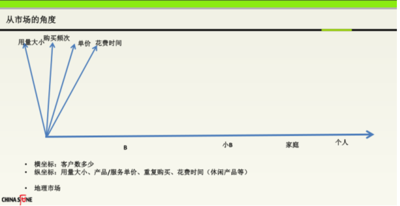 从市场的角度来看,在横坐标上,客户数从B、小B、家庭、个人递增,一般针对家庭和个人的都是规模大的产业,因为客户数量大。手机、汽车等行业,是以家庭、个人为单位的,市场非常大。比如我们去年做的海康威视,原先是2B的,给交通、银行业做解决方案,现在的产业布局已经做到家庭、个人了。在纵坐标上,客户用量的大小,购买频次、产品或服务单价、购买花费的时间等等,也给增长带来很大的变量。比如,我们现在做的华友钴业,原来是做电池的,一块手机电池用钴特别少,再做没什么大前途;现在一个汽车动力电池需要用大量的钴,那市场就起来了。还有,地理市场的扩大也有利于增长空间的出现,中国的市场是巨大的。只有大市场,才有大企业,最近流行周其仁教授的说法“水大、鱼大”,水大了鱼才能大。这就是产业机会的本质,就是供给、需求的匹配。从许多小B到家庭、个人,通过产品和服务、抵达用户的方式,围绕需求端、产品、市场、渠道,这些都是产业机会。产业最终受消费者终端的制约,所以围绕人的衣、食、住、行、医、休、购、娱、教的产业,都是比较好的产业。