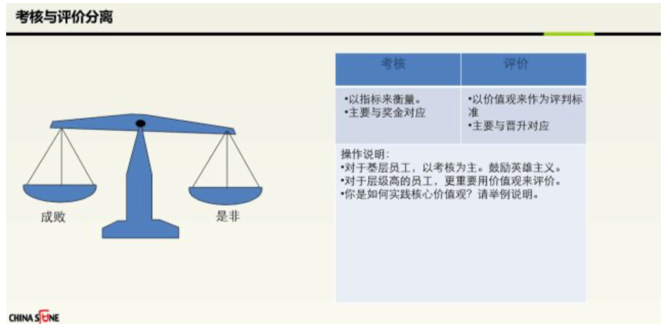 人才管理的关键在于机制,机制是什么?简练总结,就是凭什么获取报酬、凭什么分配资源。华为人才管理做得好的地方就是,“升官”与“发财”分离(升官可以理解为晋升、中长期利益;发财以短期利益为主,达标就拿钱),考核与评价分离(对基层员工以考核为主;对于中高层,要以价值观来评价),人与事分离(对于人与事的评价,有两套体系)。