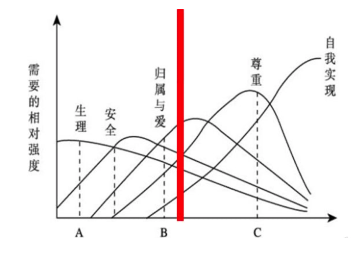 当生理需求成为社会需求基准的时候,它肯定是最大的需求,然后才是向自我实现逐渐递减的过程。当整体的社会基准需求达到了情感与归属需要和尊重之间时,这意味着绝大多数人已经脱离了基本的生存需求。