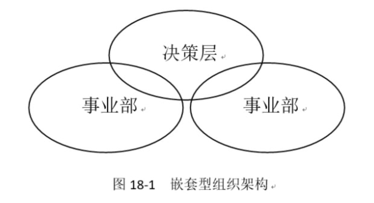 读者朋友都知道,事业部制是分权体制,直线职能制是集权体制。两者之间的中间状态就是一种嵌套型组织架构(图18-1)。它既不像事业部制那样分权,也不像直线职能制那样集权;既能保证二级经营主体的独立性、自主性和活力,也能保证整个企业战略上的统一性和风险的有效控制。