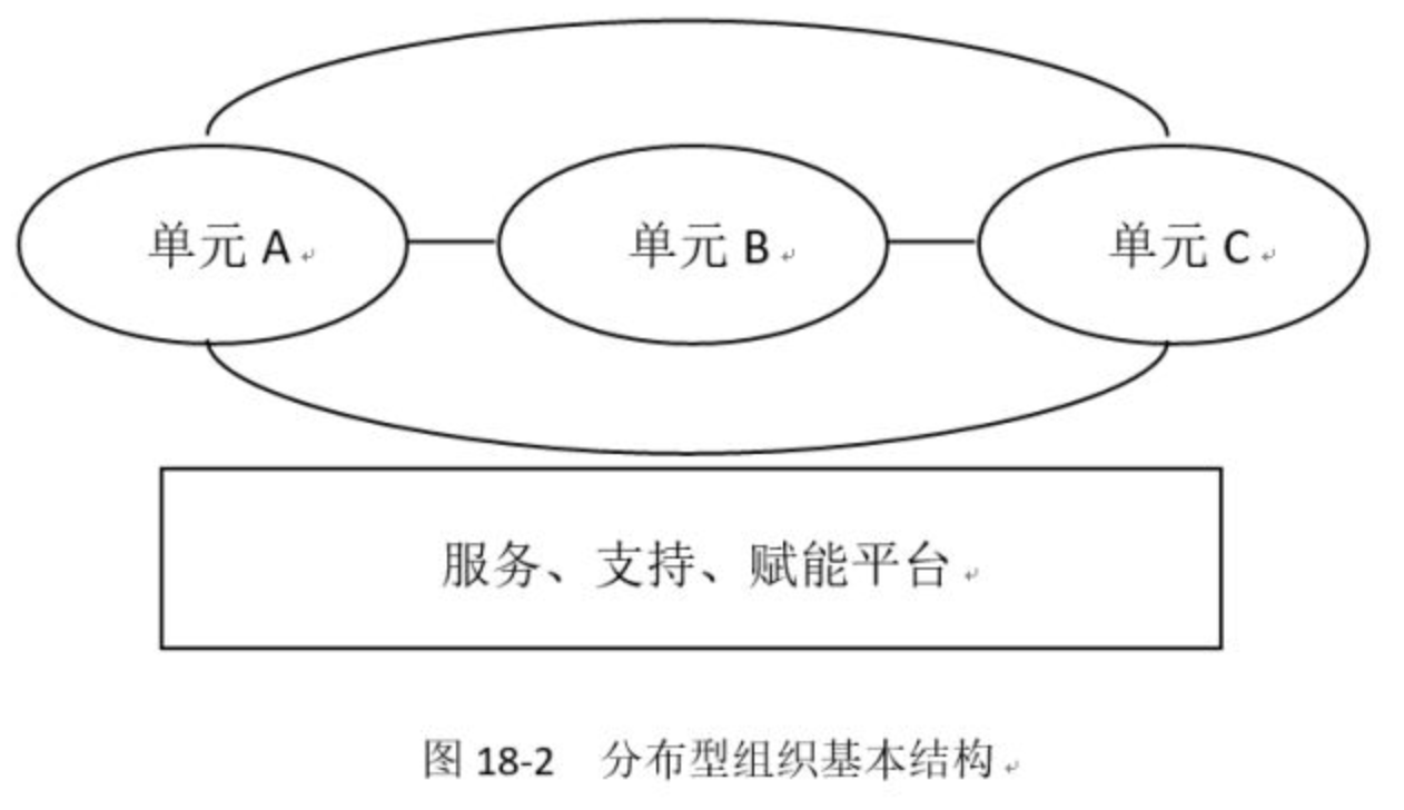 分布型组织是多中心、分散控制的组织。其基本结构是:在企业支持、服务、赋能平台上,存在多个并列的具有经营属性的小型组织(图18-2)。分布型组织也被称为单元组织及并行组织。这些并行的“单元”具有独立的地位和清晰的责权边界,往往从事同一种业务,彼此存在竞争。有的朋友也许会问,平台上有多个小的组织单元,但未必从事同一类业务,难道这就不是分布型了?分布型意指某个系统从中心控制转向了多中心控制,因此,某项业务范围内的单元衍生和扩张更接近其本意。曾于平台上的创客组织,它们的组织形式大部分是独立的子公司,已从原来的企业中分离出去了。