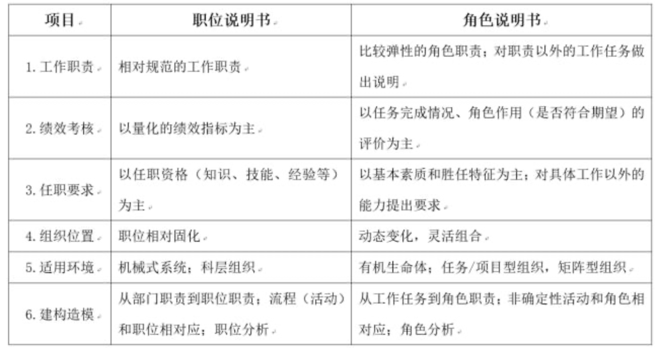 角色说明书是角色管理的基本工具。它和职位说明书在形式上大同小异,在内容上有所差异。下面我们分项进行对比(图2):